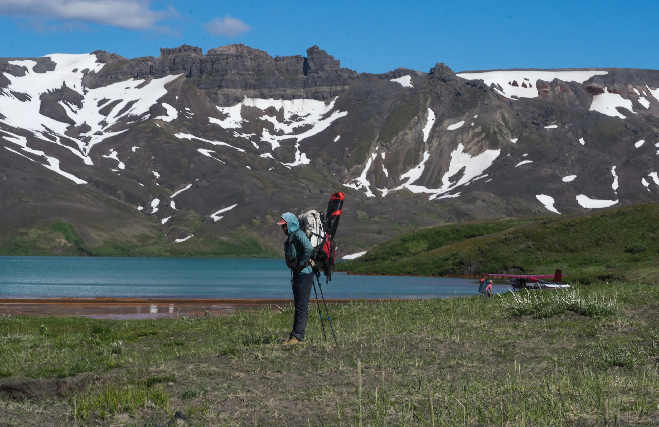 On the first day, the weather was splitter. We found a sparsely vegetated moonscape. Ridges of sharp lava are frame rolling hills of loose cinders. It looks mostly barren, but a careful eye will notice patches of moss, lichen, cryptobiotic crust trying to recolonize the crater. Lupine, stalks of lavender colored wildflowers in the pea family, find purchase between gnarled sculptures of sharp lava rock. Caribou roam and seek refuge from the summer sun on the snow drifts. Rust colored warm springs pour into Surprise Lake. Warm enough to bathe in, the springs are rich in heavy metals and leave the skin smelling like old pennies. We see bear sign all around us, large prints, scat, piles of salmon bones near the lake shore, these signs keep us on high alert.